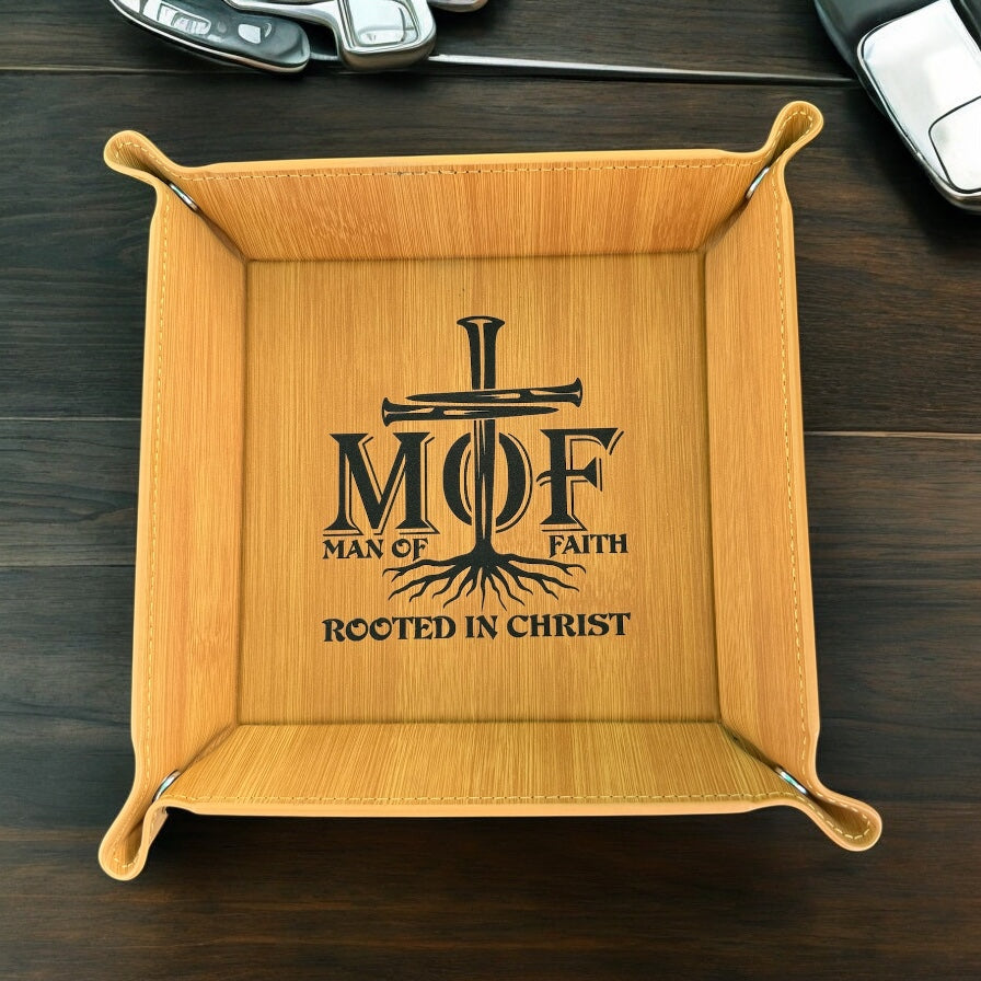 A sleek, minimalist laser engraved leather tray to keep essentials like keys, coins, and watches organized. Perfect for bedside tables, desks, or entryways, this stylish catch-all blends functionality with timeless design.