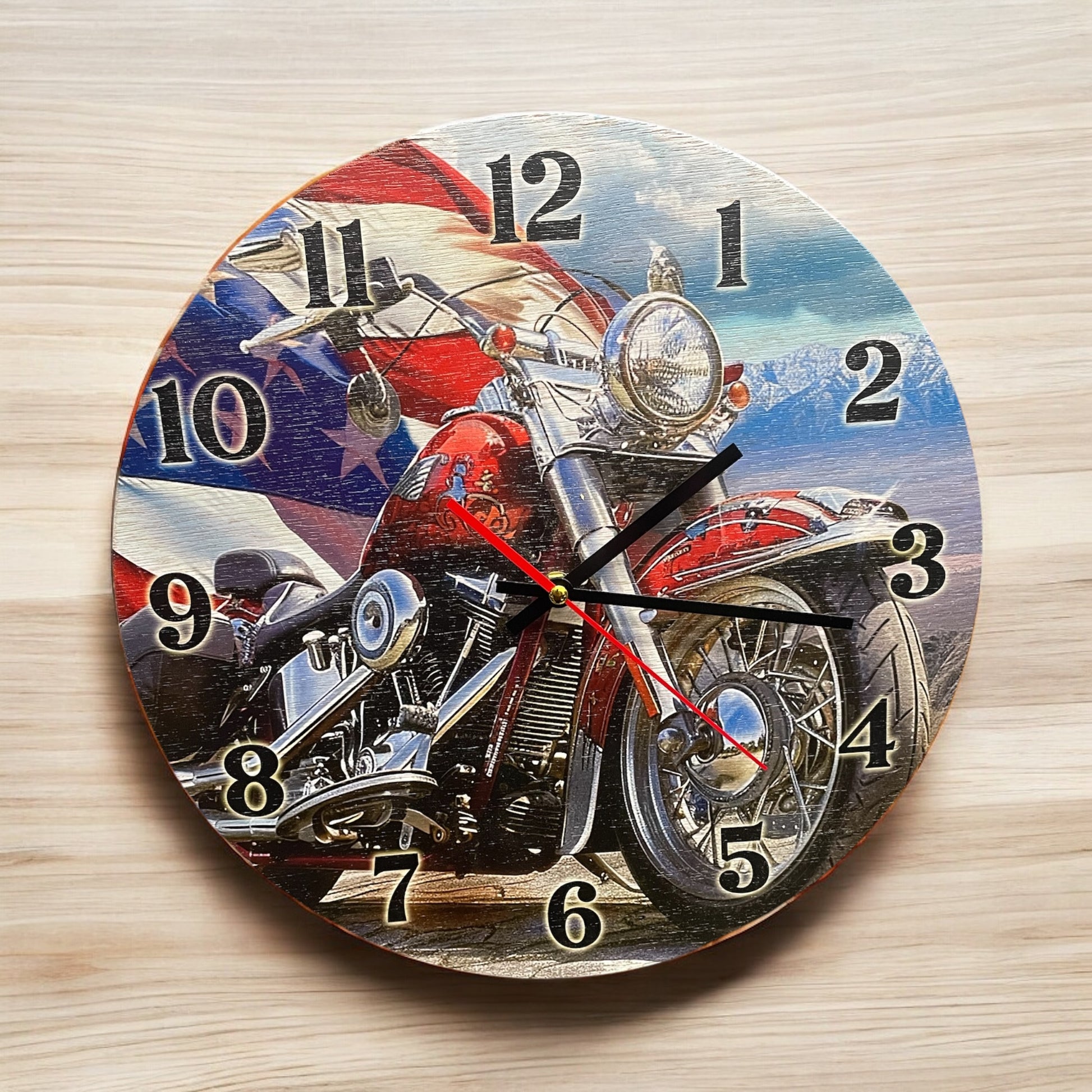Enhance your home decor with this beautifully crafted rustic wood clock featuring a striking image. The clock is made from wood with a distressed finish, giving it a charming vintage look that complements any rustic or patriotic-themed decor.